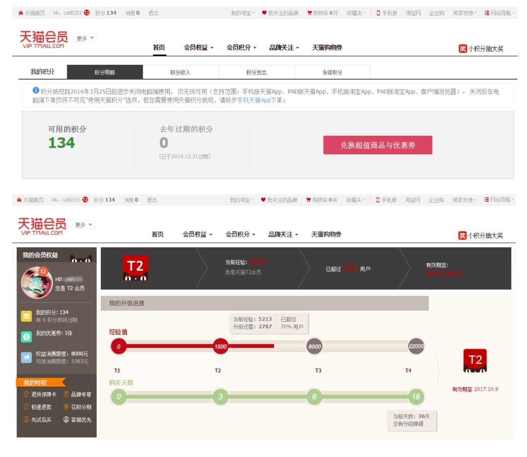 这是“天猫”网站的会员积分页面(上图)和会员权益页面(下图)。在积分页面中用户可以了解到用户相应的积分以及积分的使用情况,并且使用较大的红色按钮突出显示“兑换超值商品与优惠券”,从而促使用户在网站中的消费。在菜单中单击“会员权益”选项,进入到会员权益页面中,可以看到会员的成长进度以及当前可享受的会员权益,从而满足用户的自身价值体现。