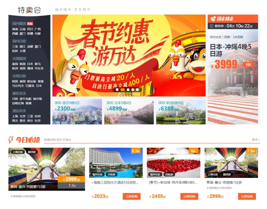 这是“途牛”旅游网的旅游产品特卖页面,在该页面中无论是顶部的推荐产品还是页面中各旅游产品都通过“折扣”“立减”“必抢”等描述来突出产品的价格优势,从而给用户一种很便宜的心理,很大程度上促进了网站用户的活跃度,促使用户快速购买产品。
