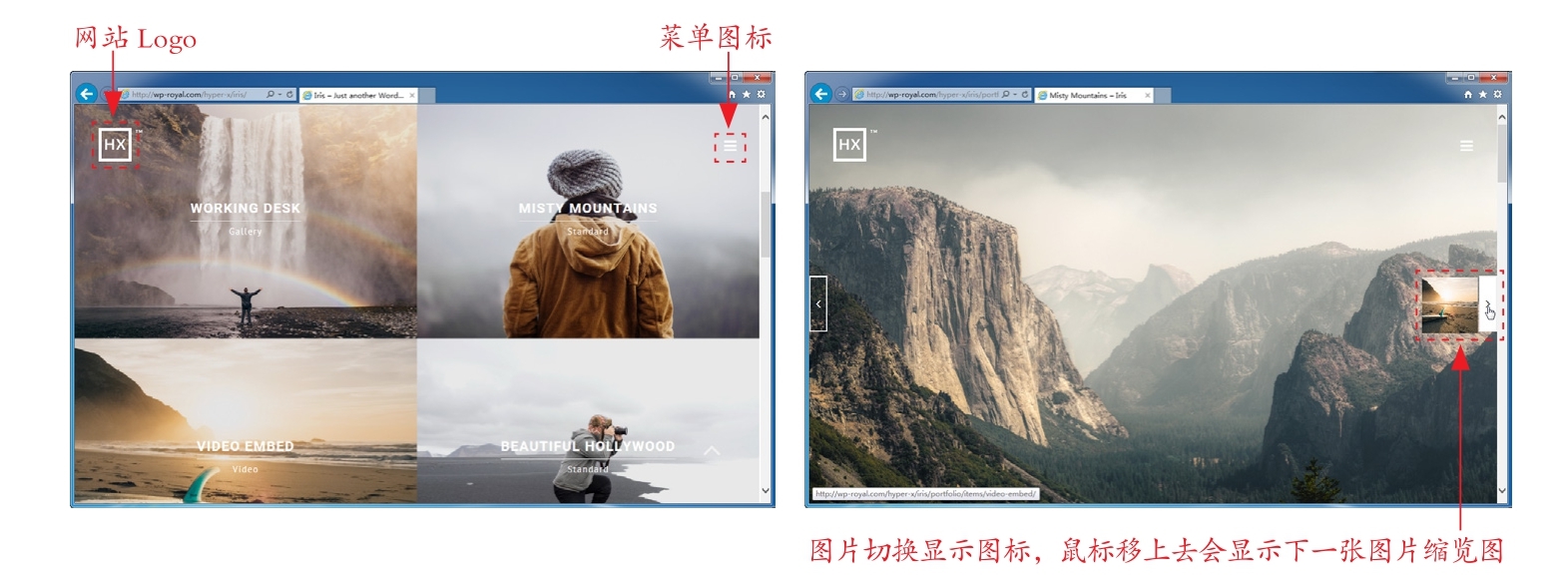 这是一个摄影相关的网站,页面的设计表现非常简捷,直接在页面中将摄影图片以方格状进行排列展示,仅仅在页面中的左上角放置网站Logo,右上角放置菜单图标,没有其他任何多余的装饰元素。单击任意一张图片,则在页面中满屏显示该摄影图片,仅在左右两侧显示图片切换图标,当鼠标移至图标上方时还会出现下一张图片的缩览图。整个网站的操作简单、直接,完全不需要用户思考。