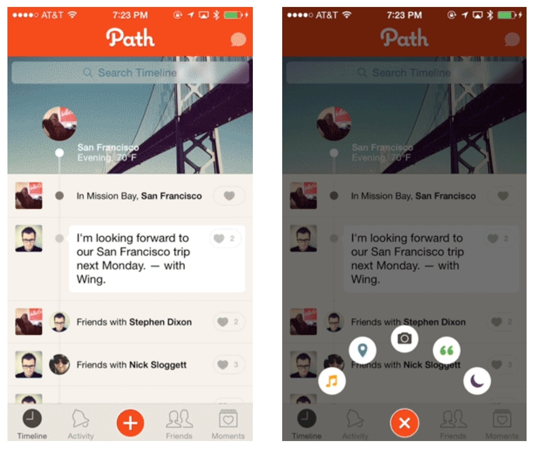 这是某手机应用的界面设计,当用户点击下方的“+”按钮时,将以交互动画的方式弹出功能按钮,显示用户可以分享的不同类型的内容。这种充满趣味性的动态交互效果,对于新用户来说,所带来的惊喜感是不言而喻的。