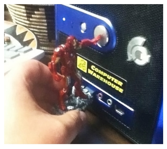 钢铁侠造型的U盘,外观是不是很酷?但是使用的时候好像出了点问题,钢铁侠的手紧紧地按住了电脑的关机键,并且手臂不能自由活动。