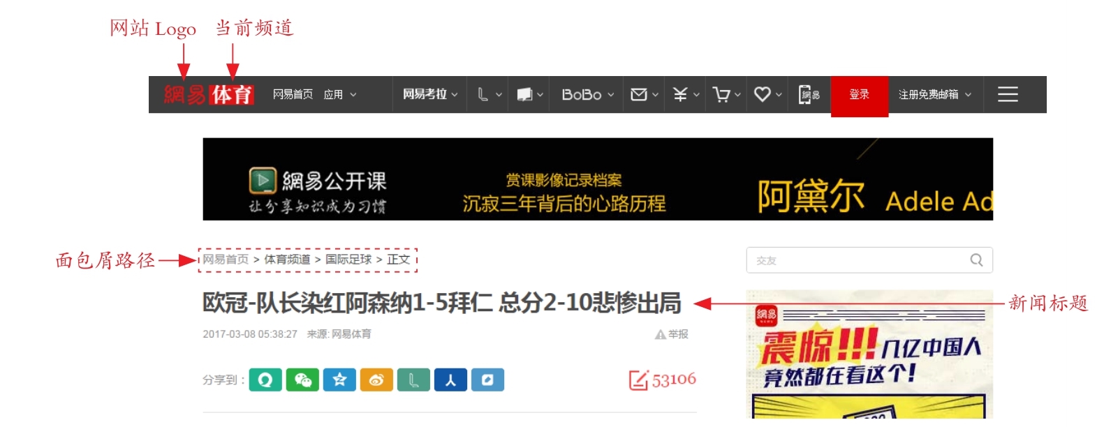 这是“网易”网站中的某个新闻内容页面,在该页面中可以看到给用户提供了非常清晰的指引,首先在页面左上角显示网站Logo,Logo图标的右侧使用红色背景突出显示当前的频道版块名称,然后在新闻标题的上方还使用面包屑路径的方式指示用户当前的位置,给用户明确、清晰的指引。