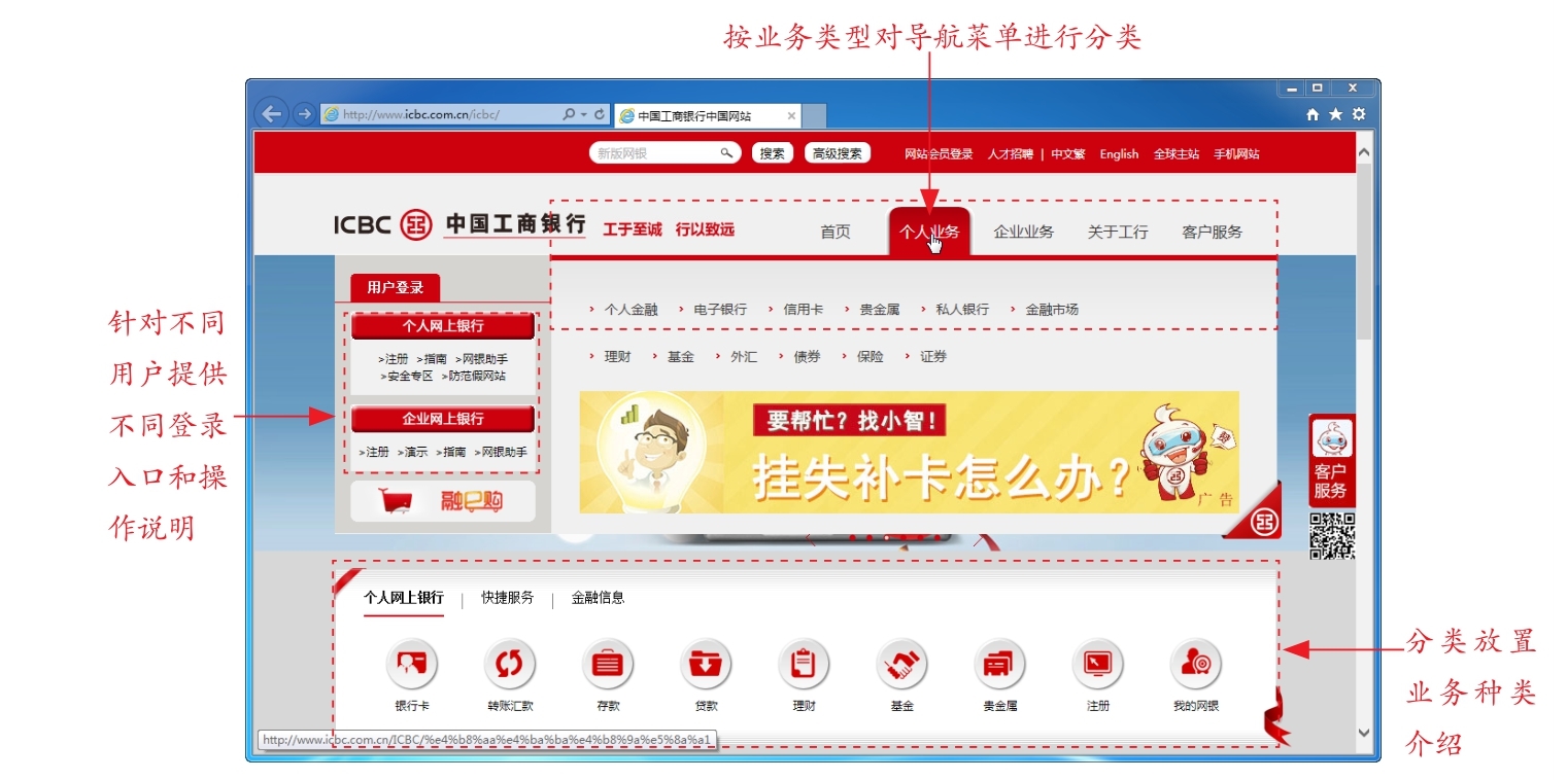 这是“工商银行”的官方网站,在导航菜单中按照业务类型对导航菜单选项进行分类放置,方便用户的查找。在页面左侧为不同的用户提供了不同的登录入口。再往下是通过图标的方式来分类展示相应的业务种类,这样的选项设置方式都是为了方便用户快速找到自己想要的信息,为用户提供最便捷的信息查找方式。