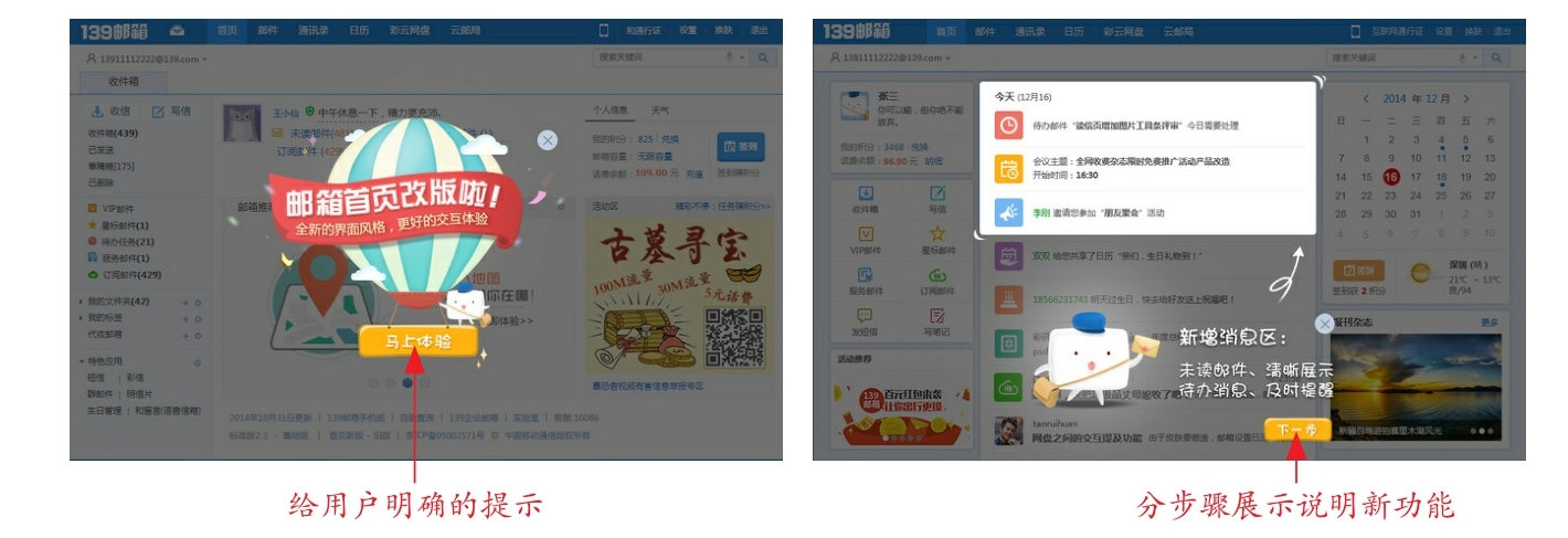这是一个邮箱改版的提示说明,这种方式在网站与APP改版和添加新功能时非常常用。当用户进入到该邮箱时,即给用户明确的提示,用户可以根据指引一步步了解新版的功能与相应的操作,帮助用户快速地了解和熟悉新功能的操作,并且将新功能的操作说明与整个界面相结合,与纯文字的帮助相比更加便于用户理解,很好地提升了用户体验。