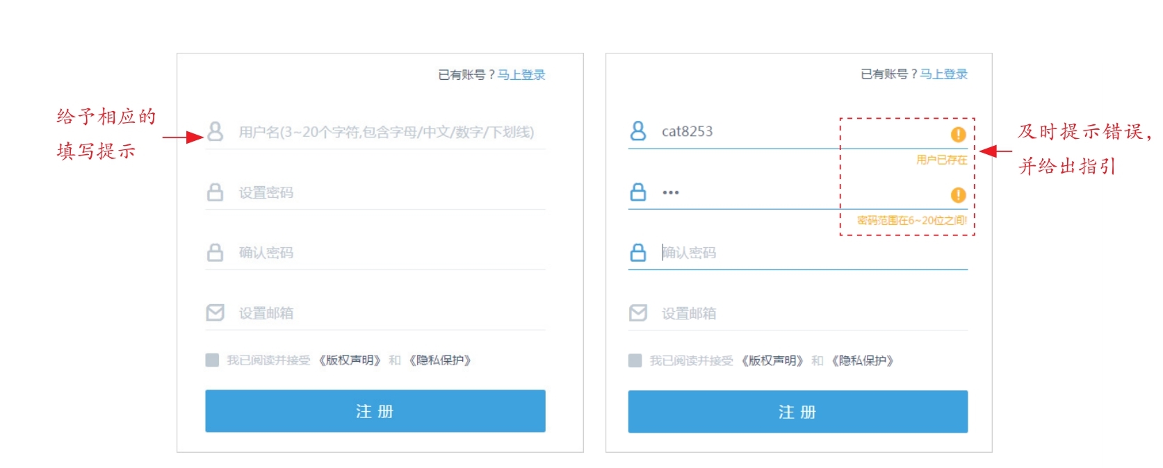 网站中的表单填写提示和错误纠正提示是为用户提供纠错支持应用最为广泛的地方。例如在该用户注册表单页面中,在各表单元素文本框中使用浅灰色文字首先给了用户相应的填写提示(左图),引导用户正确填写表单内容。当用户完成某表单项内容的填写时,系统会自动检测用户所填写的内容是否符合要求。当不符合要求时会马上在该表单元素的右侧使用特殊颜色的图标与文字及时指出用户的错误(右图),并给出所出现的问题,便于用户及时纠正,体现了“处处为用户着想”的思想。