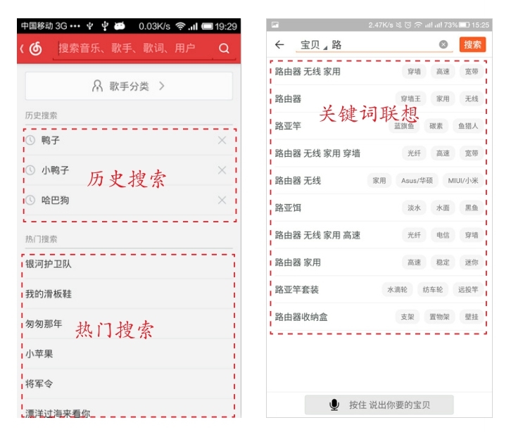在很多APP应用中,当用户进入到搜索界面时,会自动在搜索框下方列出用户最近的历史搜索记录及推荐的热门搜索关键词,方便用户快速搜索。当用户在搜索文本框中输入内容时,系统会根据用户所输入的内容在搜索文本框下方列出相应的联想关键词,这些细节都大大提升了用户体验。