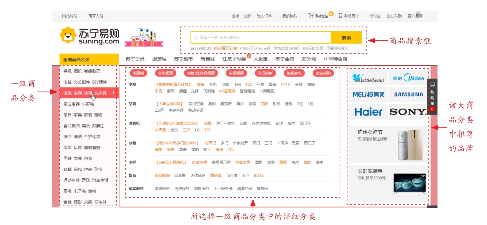 电商网站中由于商品种类繁多,在这方面设计尤其突出。针对不同水平的用户,在网站中既提供了便于高级用户直接查找特定商品的商品搜索框,也为初级用户提供了非常详细和易操作的商品分类导航,并且在商品详细分类中还对一些热销或活动类商品使用了特殊颜色表现,用户在网站中查找非常方便。