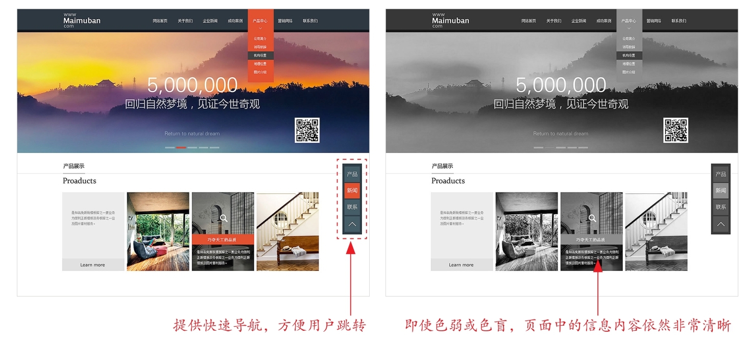 在该企业网站的设计中,因页面内容较多,所以很贴心地在页面地右侧设置了跟随页面滚动的快速导航,用户通过快速导航可以很方便地转到主要内容的位置,并且可以随时返回页面顶部。在页面的设计中遵循了文字内容与背景高对比的配色原则,即使是色彩分辨较弱的人群,依然可以非常清晰地阅读页面中的内容。