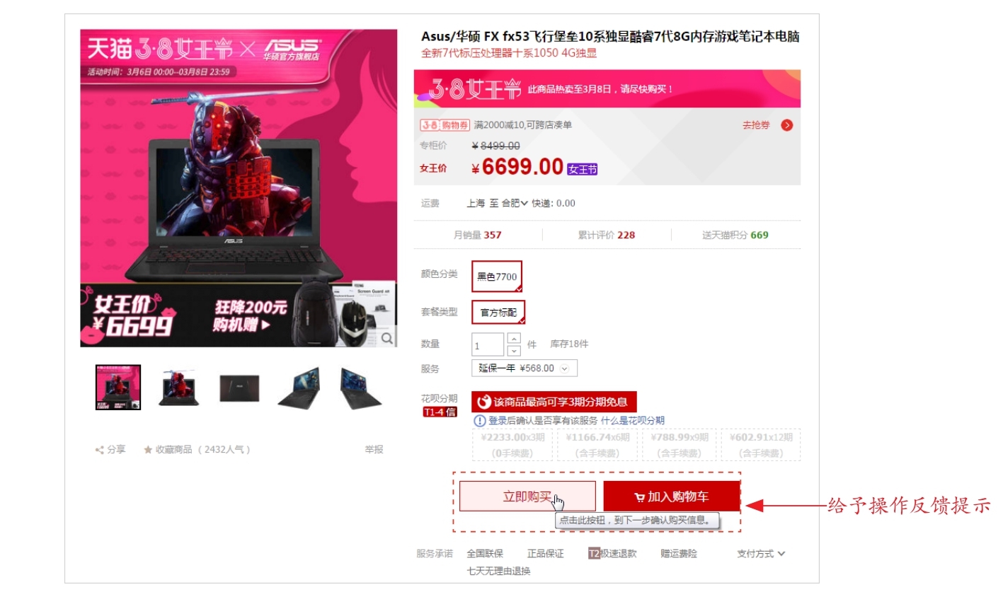 这是“天猫”购物网站中的某商品详情页面,当用户将鼠标移至按钮上方悬停时,会给用户反馈,当单击该按钮后将出现页面提示。这样及时的信息反馈可以很好地满足用户的期望,为用户的下一步操作给出指引。