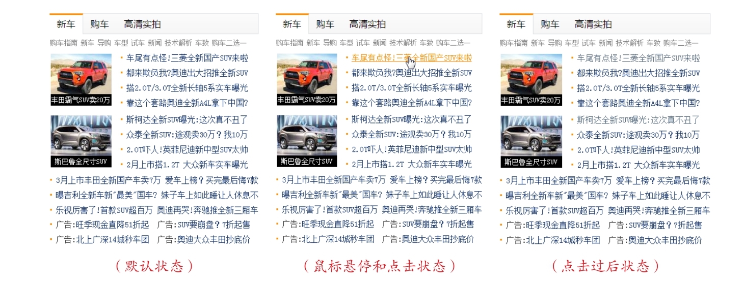 在“新浪”网站中为文字超链接设置了3种状态:默认状态,新闻标题超链接文字显示为蓝色无下画线的效果;鼠标悬停和点击状态,新闻标题超链接文字显示为橙色有下画线效果;点击后状态,新闻标题超链接显示为灰蓝色无下画线效果。这样用户能够轻松地分辨出哪些信息已经阅读,哪些信息还没有阅读。