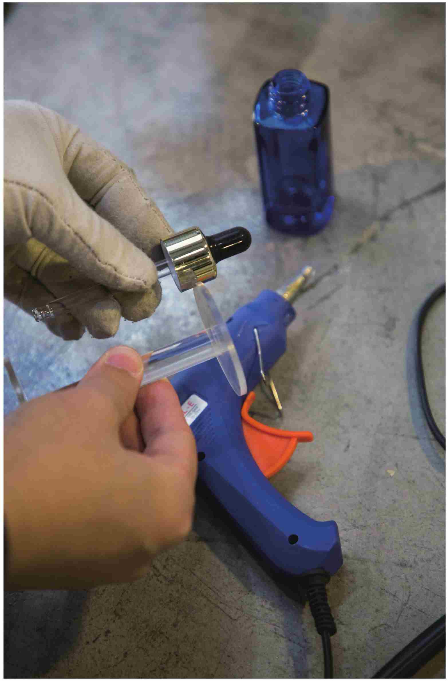 13.仍然用热熔胶,不过这次我们把瓶盖固定在比较薄的棱边上。