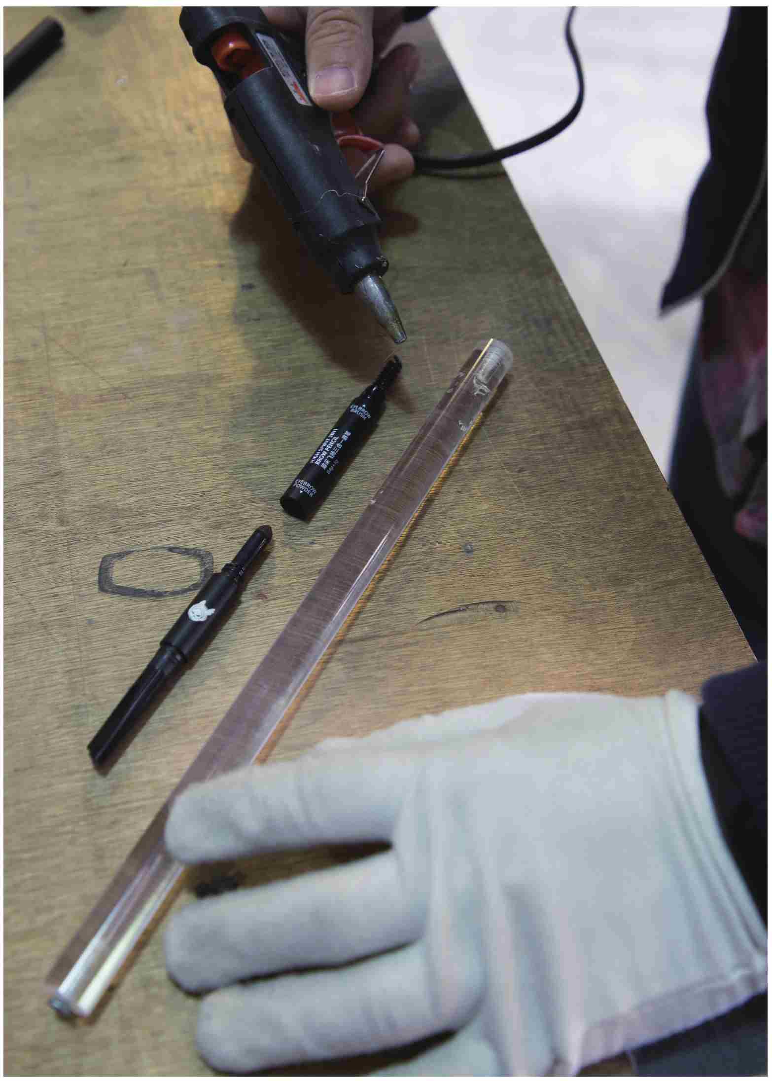 我们使用热熔胶(枪),把产品顺着直线粘在玻璃棒上。