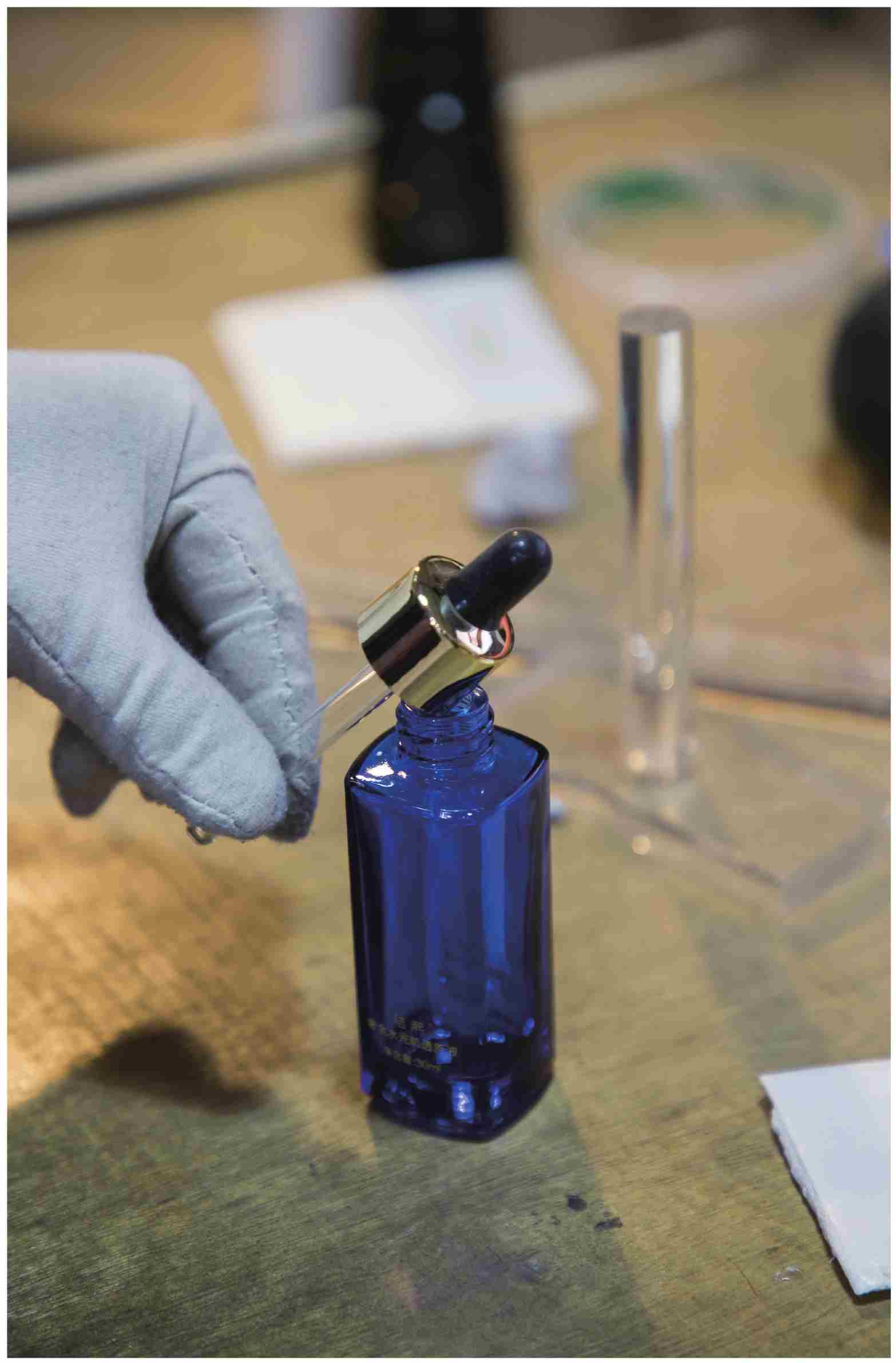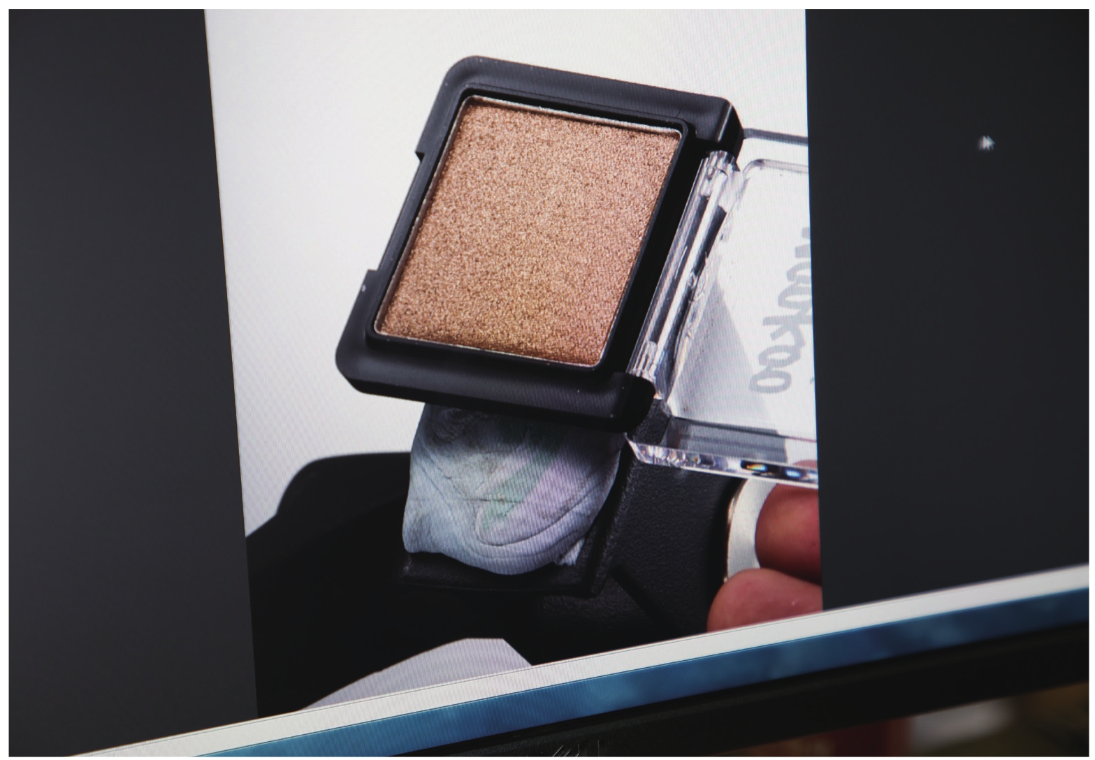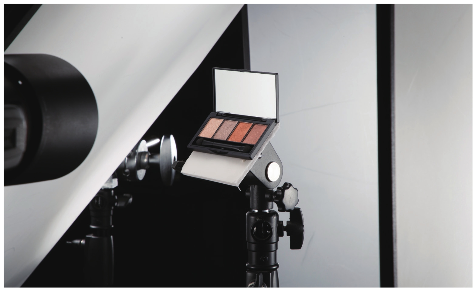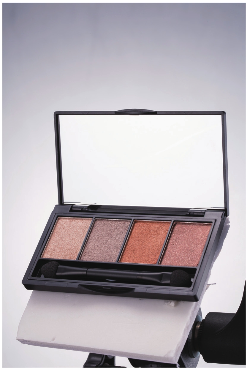 3.暗色的产品和亮调淡色的产品支撑方法不一样,拍摄时要随时变换。如果我们仍然像支撑粉红色的粉饼盒一样,拍摄出来的产品照片边缘就会有一道暗黑,修图师就必须人为地“画”上白边,无形中增加了工作量。