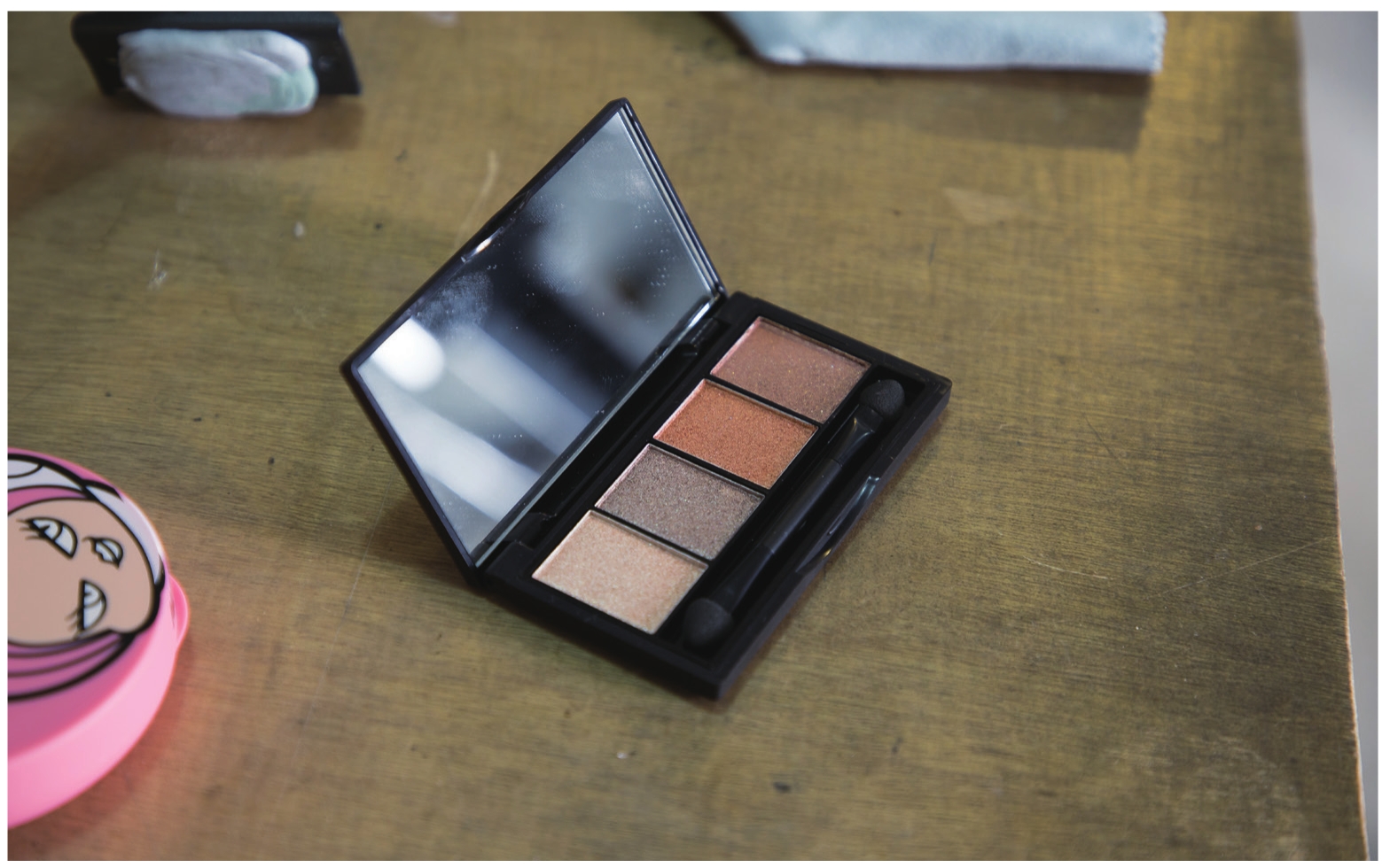 2.这次我们拍摄是一盒四格眼影。它的盒体是黑色有机玻璃,不同于旁边淡色的粉饼盒。