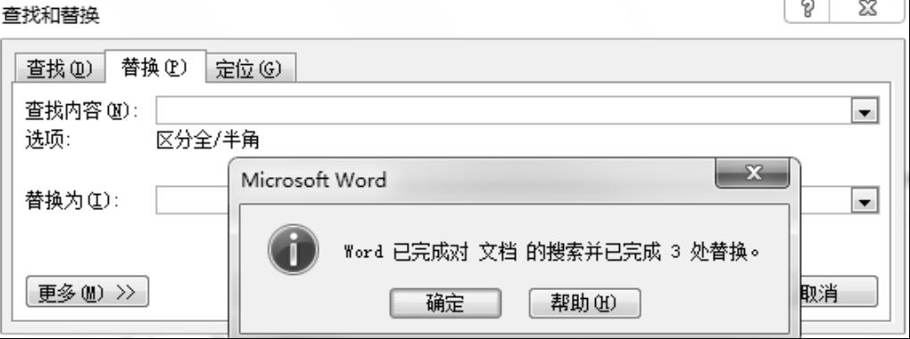 ④ 单击“全部替换”按钮,Word 将删除所有的空格,此时会弹出替换完成的对话框,显示共替换多少处,单击“关闭”按钮,如图2-8所示。
