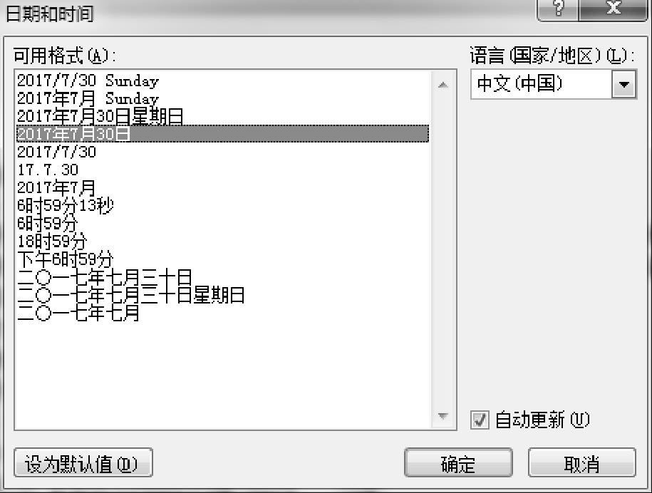 ② 选择“文本”组中的“日期和时间”,弹出“日期和时间”对话框,如图2-9所示。