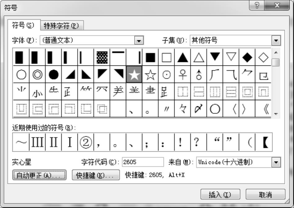 ③ 在“符号”对话框中选择“符号”选项卡,字体选择为“普通文本”,子集选择为“其他符号”,找到所要插入的特殊符号“★”,单击该符号,单击“插入”按钮,或者直接双击该特殊符号,连续插入两个“★”,如图2-7所示。