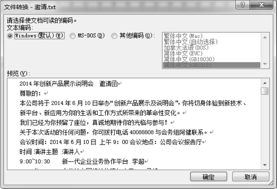 ③ 在“插入文件”对话框中选择“邀请.TXT”文档,单击“插入”按钮,弹出“文件转换-邀请.txt”对话框,文本编码选择“Windows(默认)”,单击“确定”按钮,如图2-6所示。