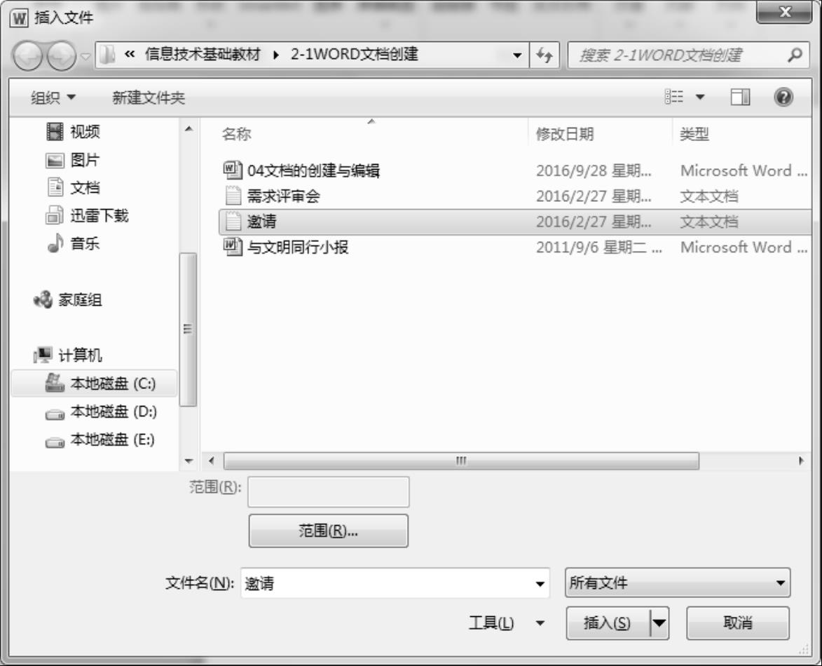 ② 在“文本”组中选择“对象”工具,选择“文件中的文字”选项,弹出“插入文件”对话框,如图2-5所示。