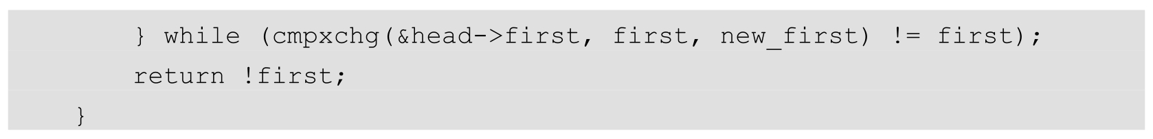 内核实现的方法是使用cmpxchg宏。这本来是一个Intel平台的汇编指令,Linux喜欢这个指令,但其他平台不一定有,所以就封装了一个宏,在其他平台重新实现,而Intel平台直接调用cmpxchg指令即可。这个指令是原子的,有3个参数,对比第一个和第二个参数,如果相等则写入第三个参数到第一个参数指向的地址。如果不相等则返回第三个参数。本意是将第三个参数写入第一个参数指向的地址,但是加上对比后在写入之前第一个参数指向的内存就不会被其他任何指令修改,这就确保了在写入操作之前和之后的一致性。具体到llist就是在添加链表节点到头部时,需要确保在修改head->first指针时,没有其他的并行操作也在修改,因为同时修改会造成并发的操作,产生无法预知的后果。所以cmpxchg先读出head->next,然后head->first作为第一个参数,刚读出的head->first作为第二个参数,要添加的新节点作为第三个参数。代码如下。