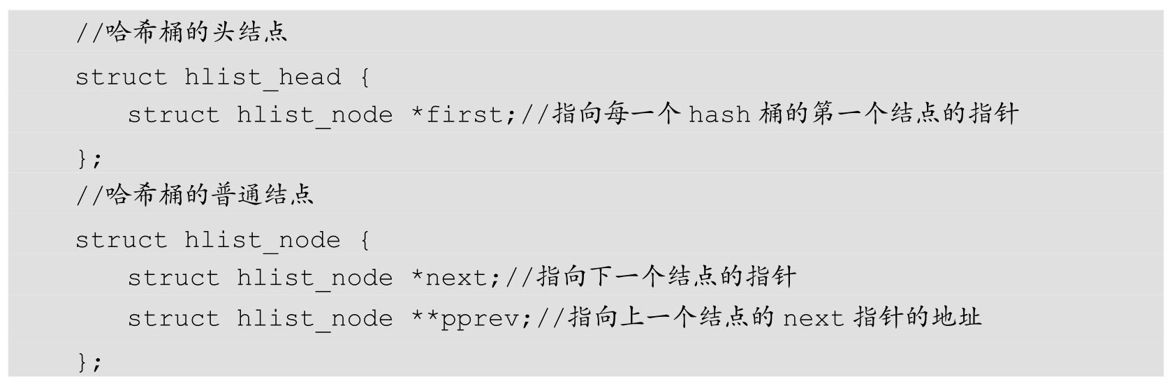 通常情况下,哈希表大部分的域都是空白的,而哈希表所需要的大小却要提前分配,只有每个哈希桶的链表才可以动态分配。一个双向链表的头部有两个指针的大小,如果这两个指针全部放入哈希表要提前分配空间,就会比单链表消耗多一倍的内存空间。所以内核专门设计了hlist,拥有只有一个指针大小的头部的双向链表。如图3-1所示。
