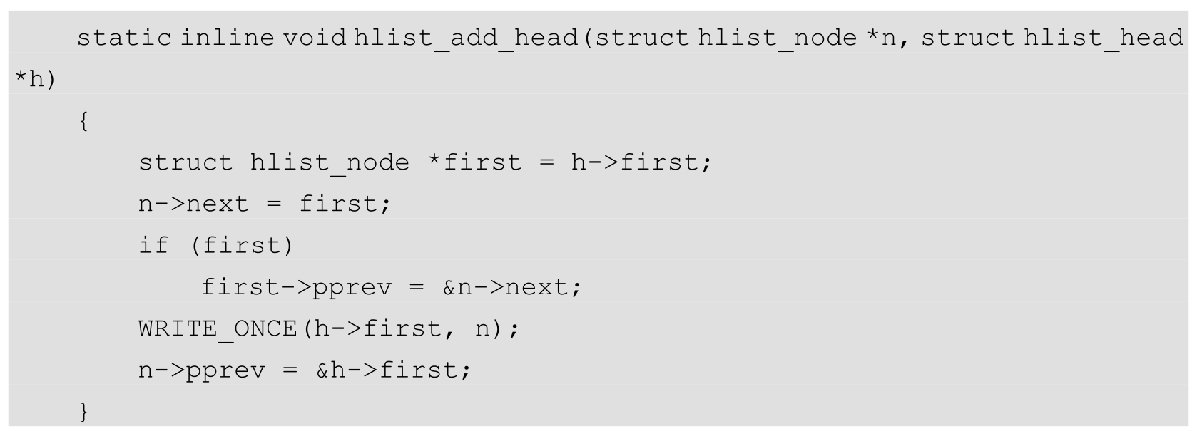 Linux双向链表是环形的,而hlist有特定的头部结构。其头部只有一个first域,用来指向第一个节点(一个头部只有一个整数大小)。而第一个节点和后续的节点的结构都是一样的,只是第一个节点的next和pprev都是指向头部的first域。后续节点的next指向的是下个节点的next域(就是下一个节点的地址),而pprev指向的是上一个节点的next域。在整个链表的设计中,与双向链表的不同有两处,即头部和pprev。而pprev本质上又和双向链表的prev是一样的,都是指向上一个链表数据结构的地址。代码如下。