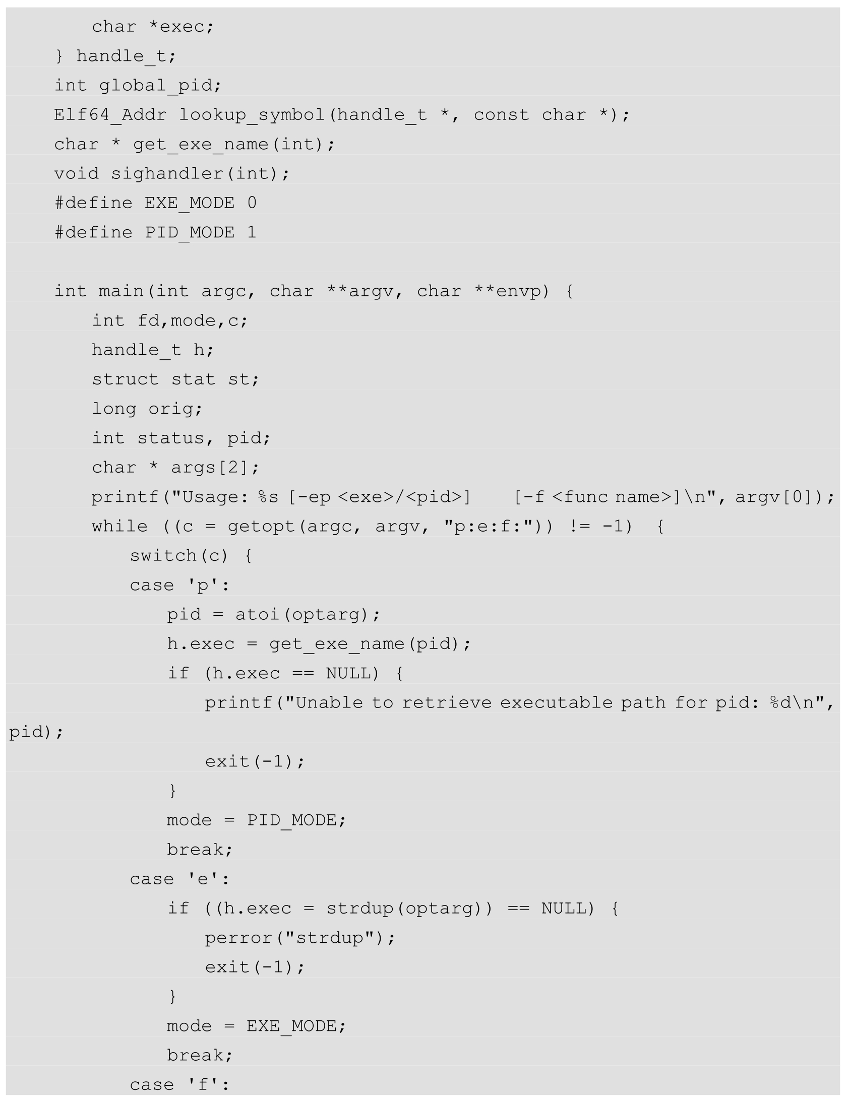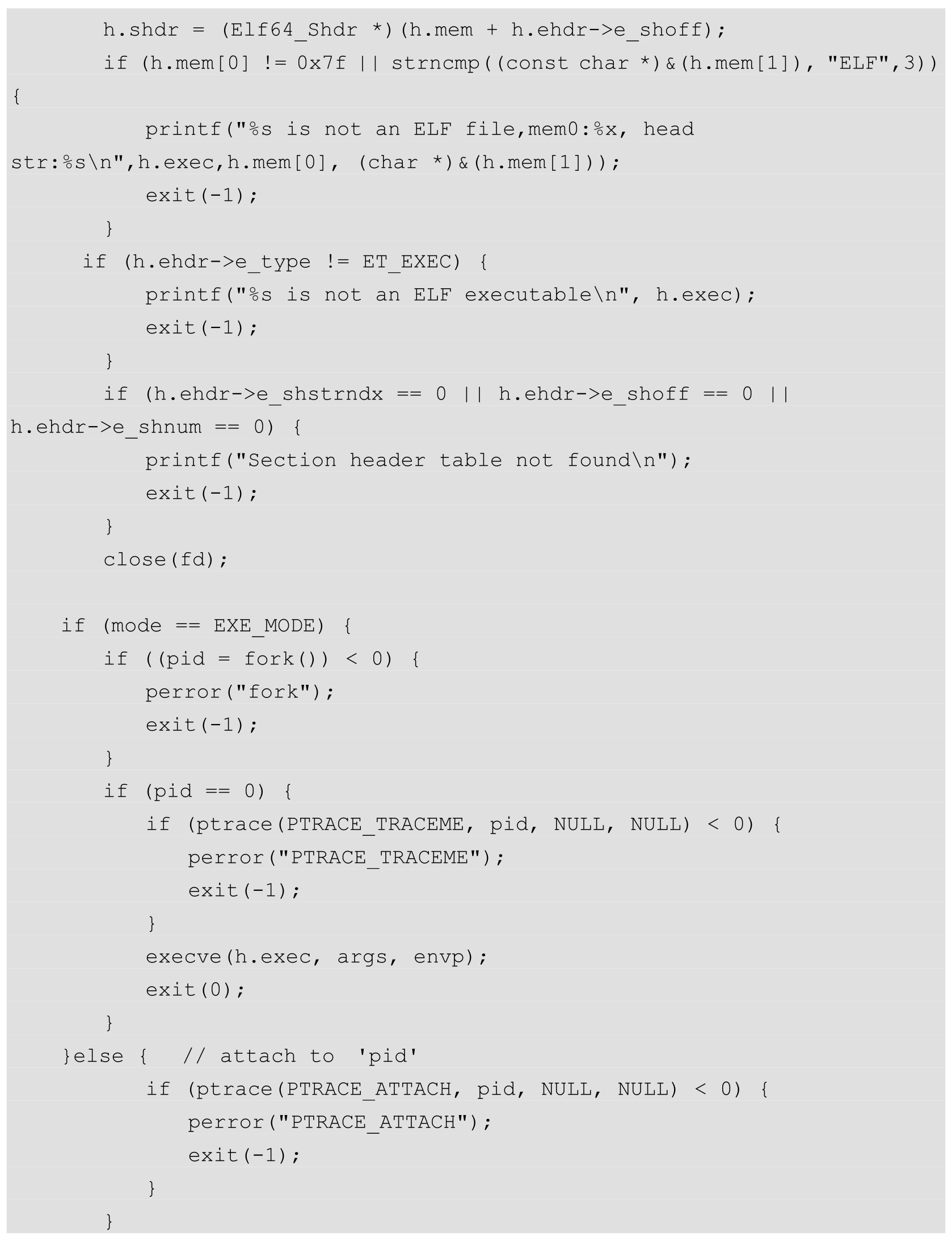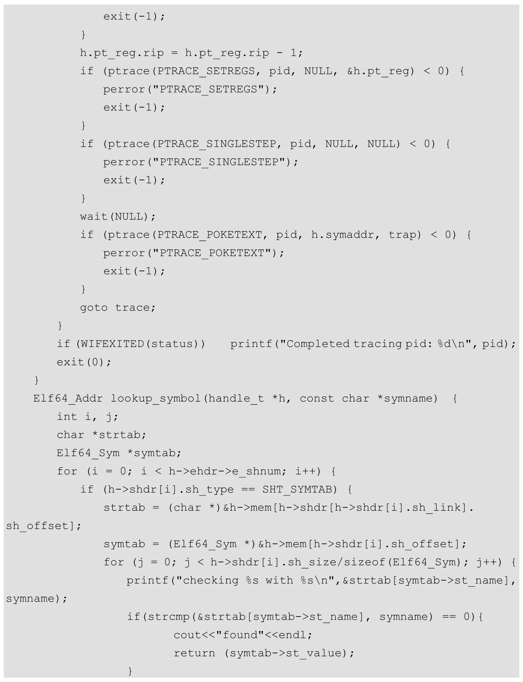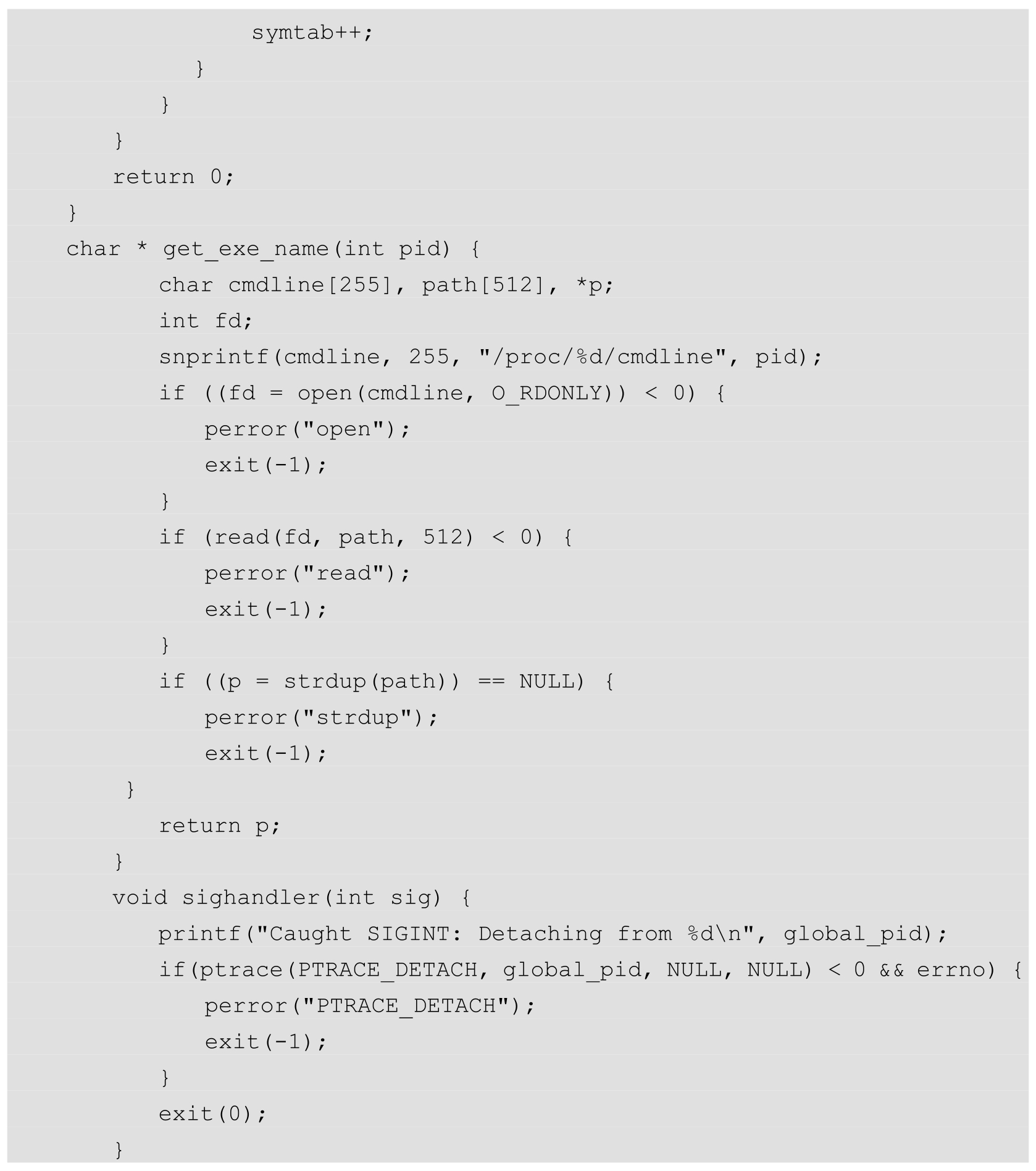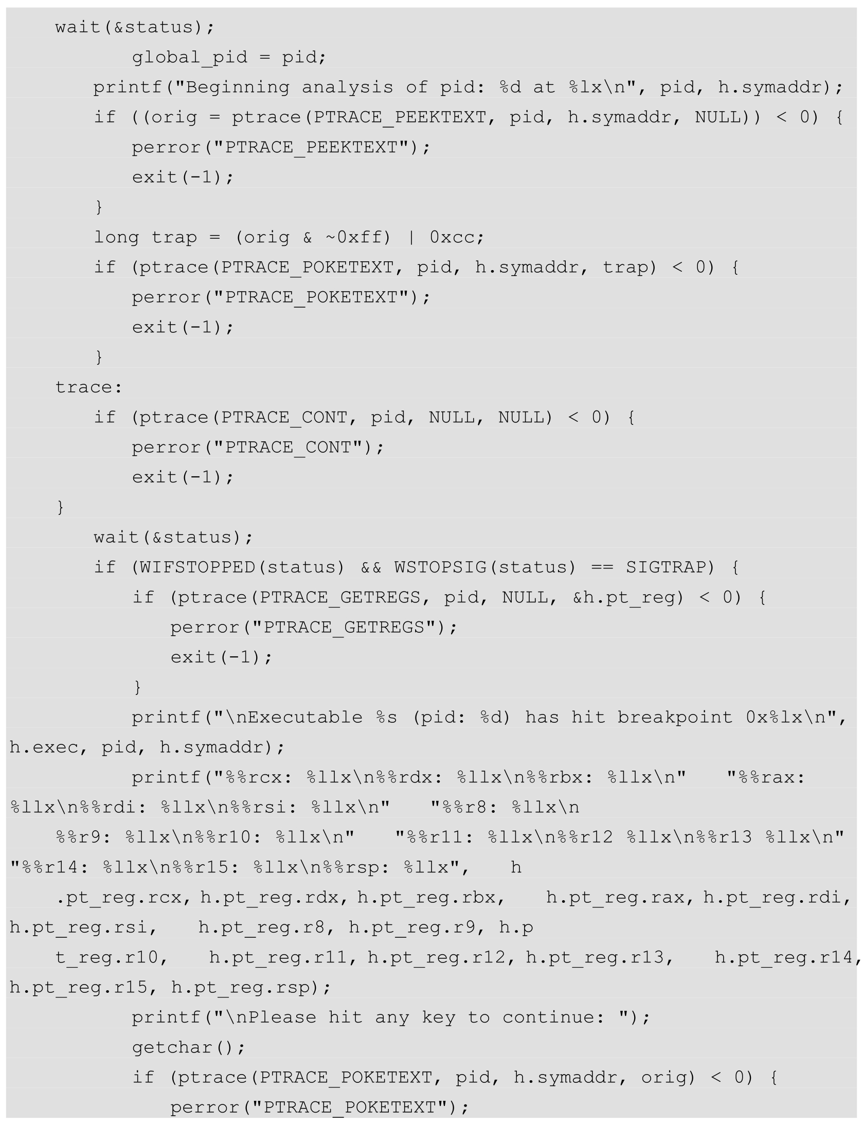 由于ptrace是以线程为单位的,也就是说如果一个进程有多个线程,父进程就需要分别ptrace所有的线程,如果多线程的程序在设计的时候没有考虑被ptrace,那么在使用ptrace时就要非常小心,一个暂停可能就会影响进程整体的执行。例如一个没有被ptrace的线程在不断地向缓存里写数据,由于你的ptrace调用可能导致ptrace的消费者线程运行速度变慢,导致缓存爆炸。下面给出一个完整的ptrace实例程序,读者可以在机器上直接编译,可逐步修改以理解其中的含义。