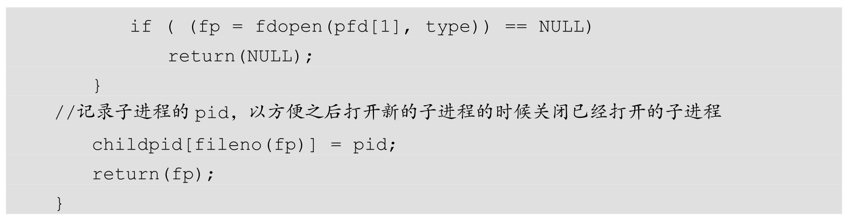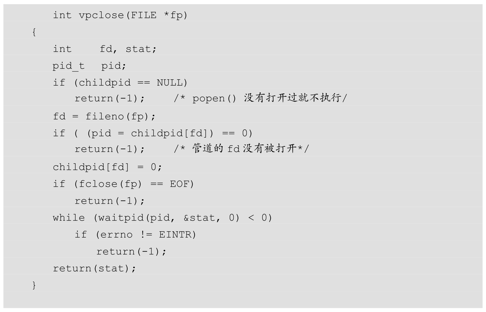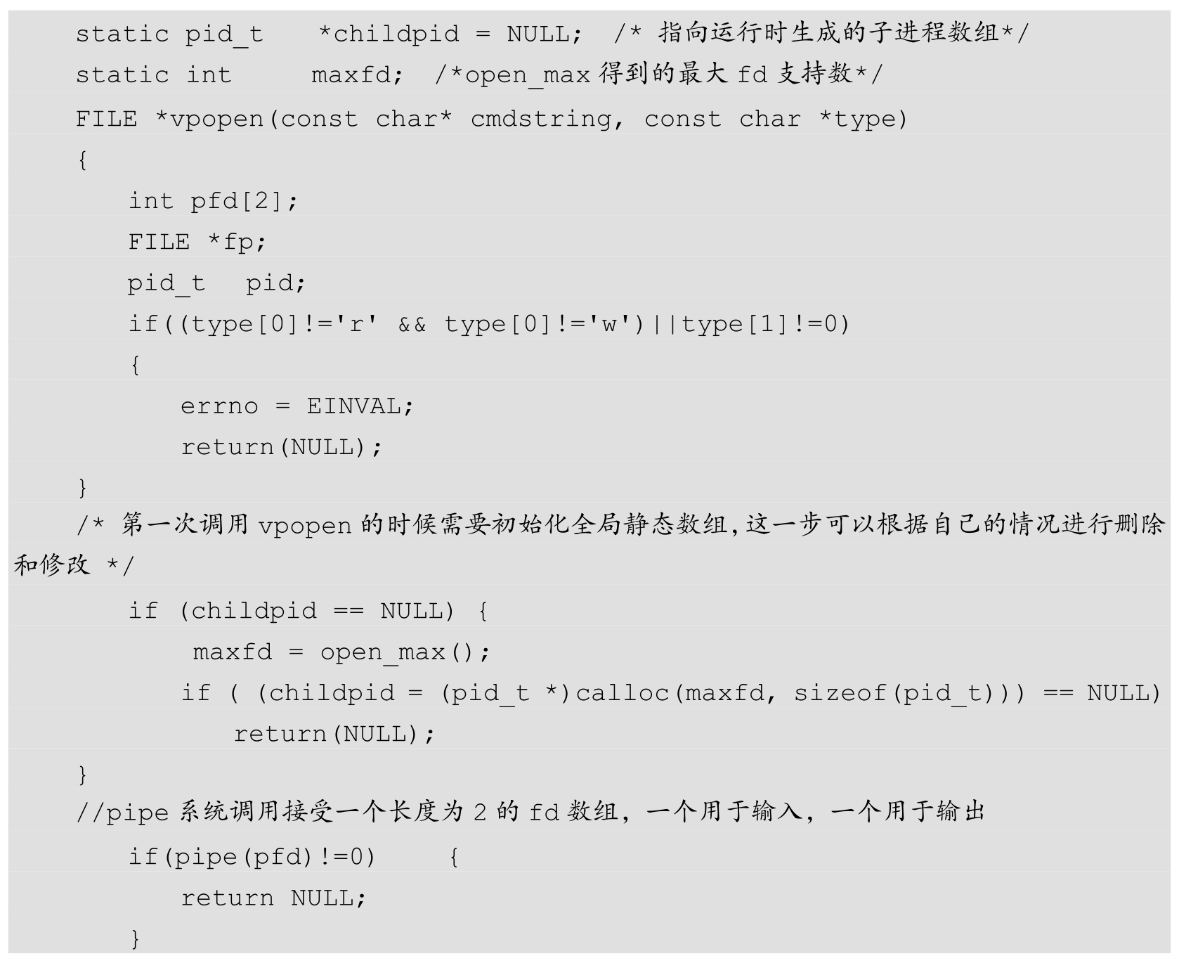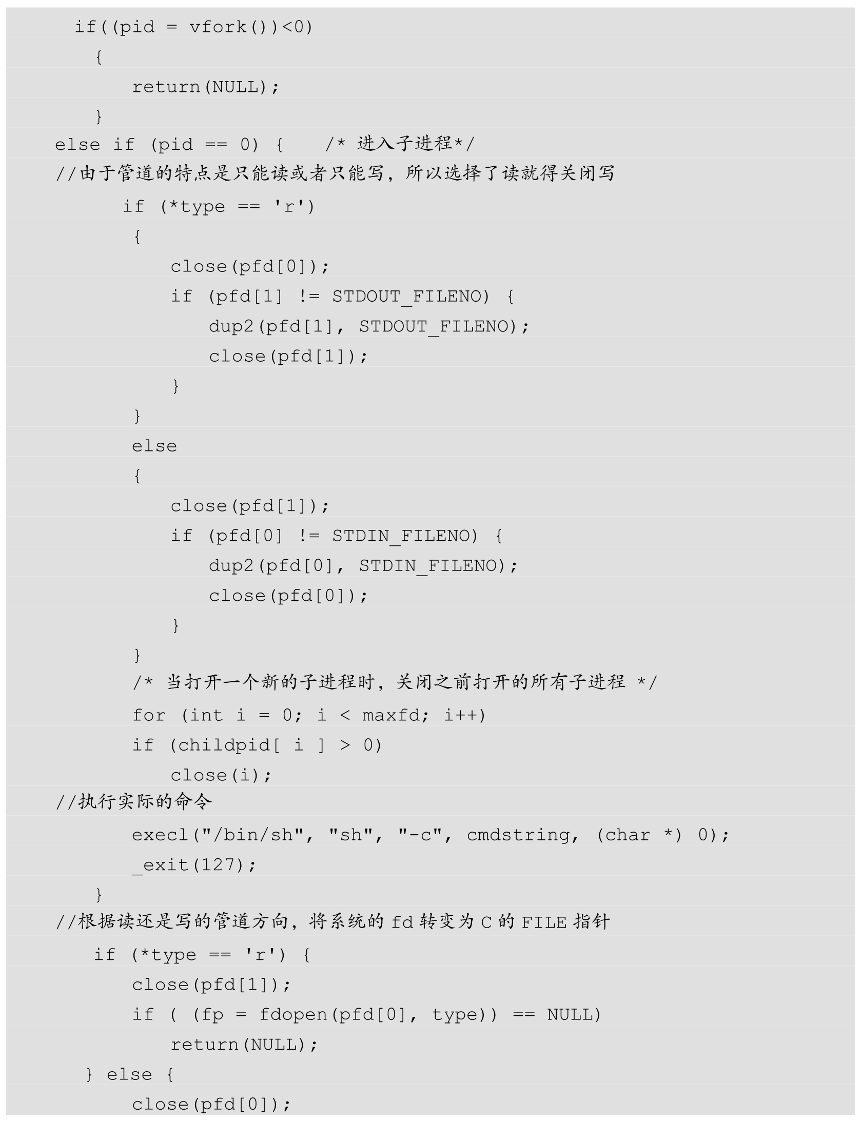 我们对比打开操作与系统的pipe调用的区别,就能发现有两个显著的不同:一是使用了vfork,虚拷贝不会造成内存不足的问题和其他的继承问题;二是每次调用vpopen时都要关闭之前调用打开的子进程,这个功能可以根据需要删除。关闭逻辑如下。
