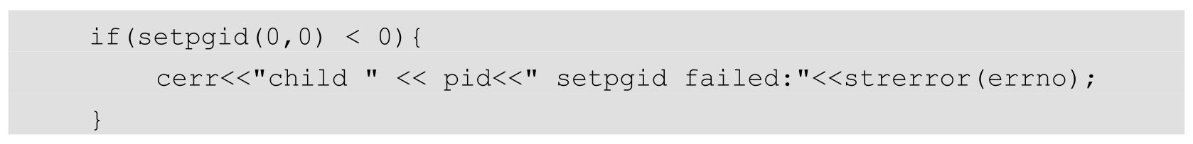 如此将生成的子进程以及孙子进程都纳入同一个进程组,并且与父进程不一样,如果父进程在等待子进程时超时,就可以直接强制关闭整个子进程组,而不影响父进程本身。