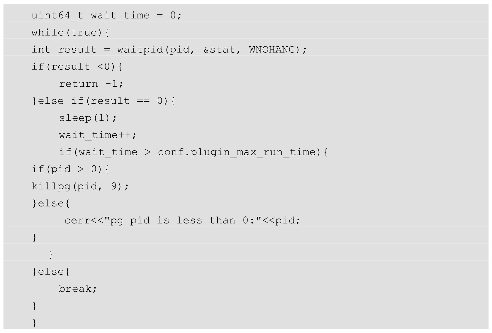 一般情况下,使用waitpid操作不会那么顺利,所以应根据实际情况做出如上的修改。这样当waitpid因为其他原因退出时,不至于错过子进程的回收时机,能够避免子进程defunct。还添加了允许子进程运行最长时间的逻辑。对应的可以在vpopen中生成的子进程中添加,进程组代码如下。