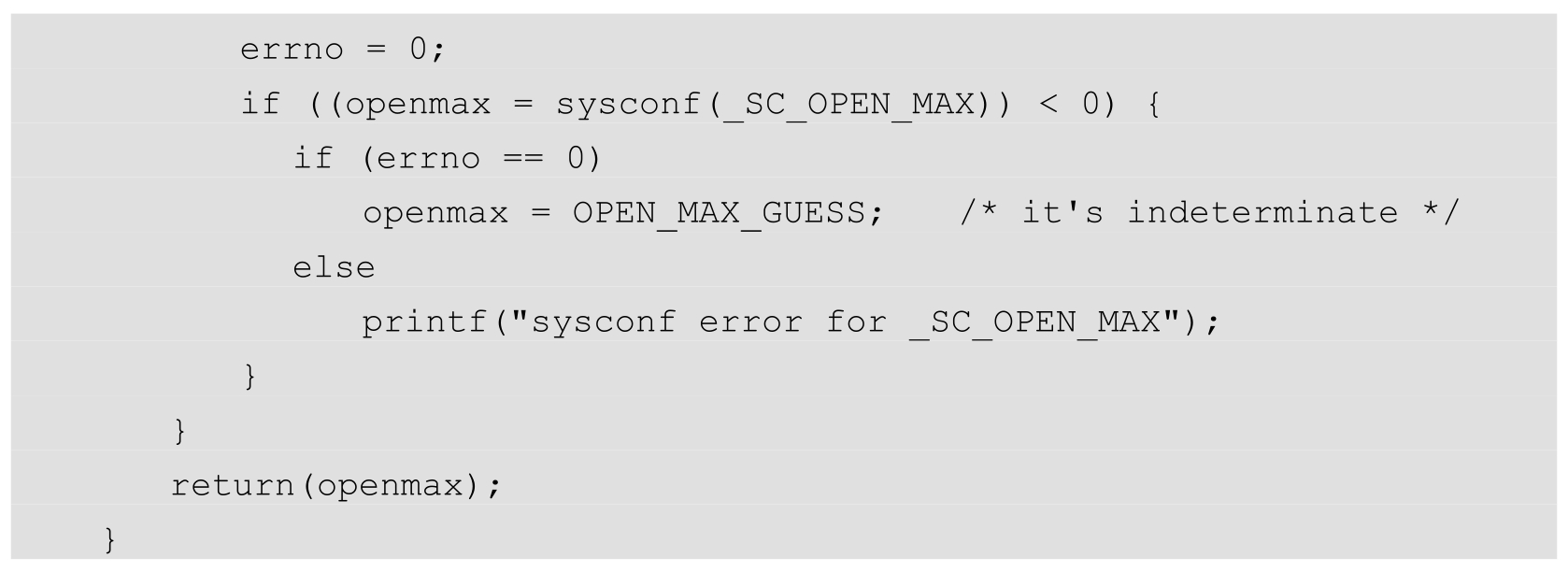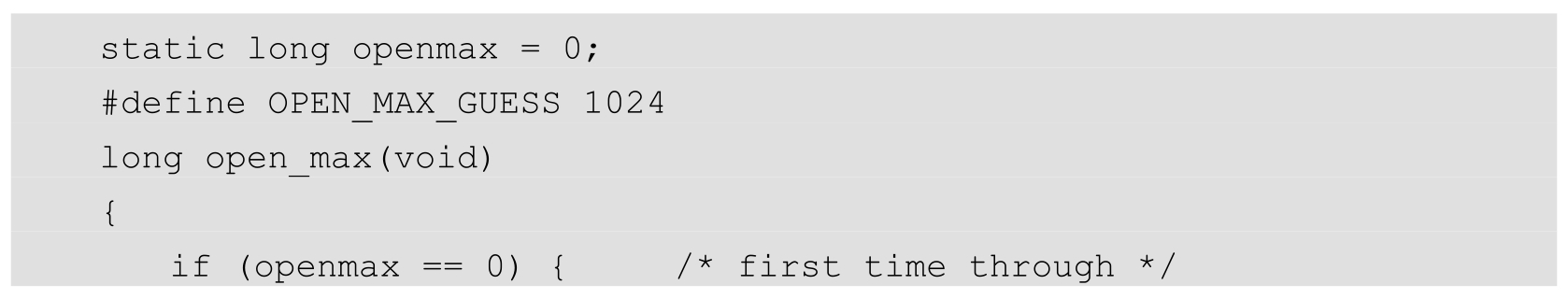 这部分的封装代码是stackoverflow上的某位网友的作品,笔者一直在使用他的修改版,非常稳定。在实际的使用中,很多时候只需要一次打开一个子进程,其中的一些逻辑就可以删除,但是这样也可以直接使用。要实现这样的一个封装,首先要获得最大的可打开的fd数目,示例如下。