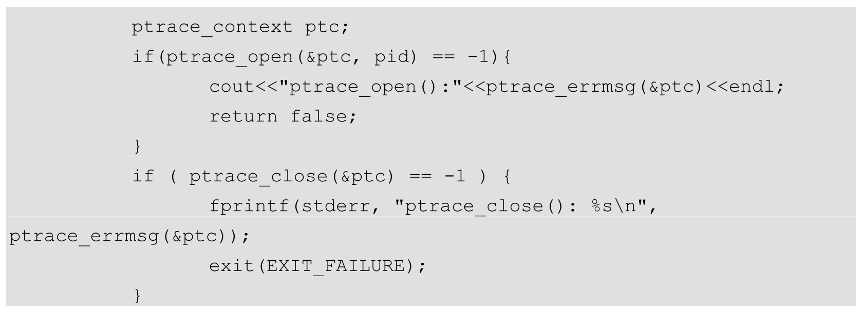 另外ptrace可以被用于入侵系统做注入,ptrace之前的默认行为可以覆盖mmap或者mprotect的权限设置,即使是.text的READONLY域也能被写入,但是后来内核打了pax或者grsec补丁,就能在一定程度上限制这种行为。使用ptrace直接向运行中的进程注册代码是可行的,所以ptrace系统调用可以用来攻防。如果要使用ptrace的功能,建议首先详细且尽可能地使用libptrace库。示例如下。