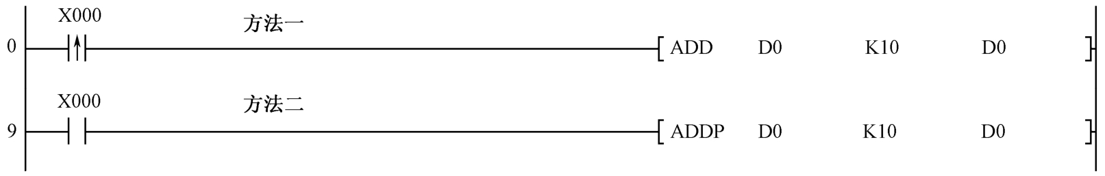 指令分为连续执行型和脉冲执行型,如果是连续执行型,那么在驱动条件成立时,每一个扫描周期,指令都会执行一次。如图1-36所示,在X0接通期间,每个扫描周期,存储器 D0的内容都会加上 10再存入 D0。如果只希望一次性执行,采用脉冲执行型即可,在图1-37中,两种处理方法均可。