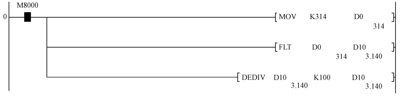 FX 2N PLC不具备直接输入浮点数(下称小数)的功能。在浮点数功能指令中,参与运算的数必须是小数才能完成运算功能。因此,在应用浮点数功能指令前,存在一个把整数和小数如何输入到浮点数运算所指定的软元件中的问题。这里仅有一个例外,即常数K/H所表示的整数在运算过程中会自动转换成小数而参与运算,如图1-38所示。