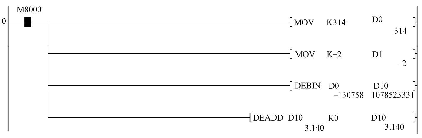 二进制→十进制转换指令 DEBCD主要用于取出十进制数供给外部设备进行监控和显示用。而十进制→二进制转换指令则提供了另外一种小数的输入方法。程序如图1-44所示。同样是将小数3.14输入到(D11,D10)。