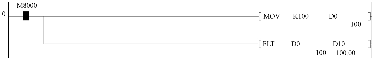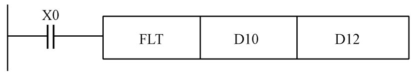 解读:当 X0接通时,把(D10)里所寄存的整数转换成小数寄存在(D13,D12)中,指令中原址和目标地址中所用软元件仅为D存储器。