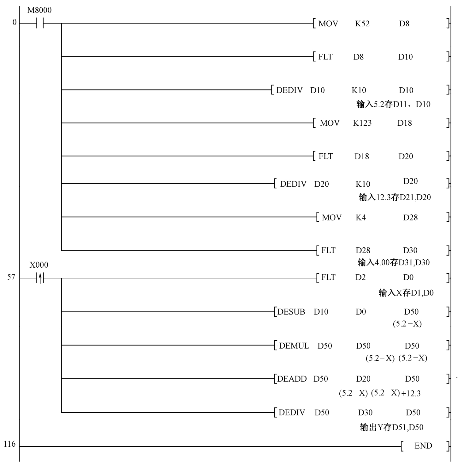 设 X 存(D2),输出 Y 存(D51,D50)。运算程序如图1-42所示。