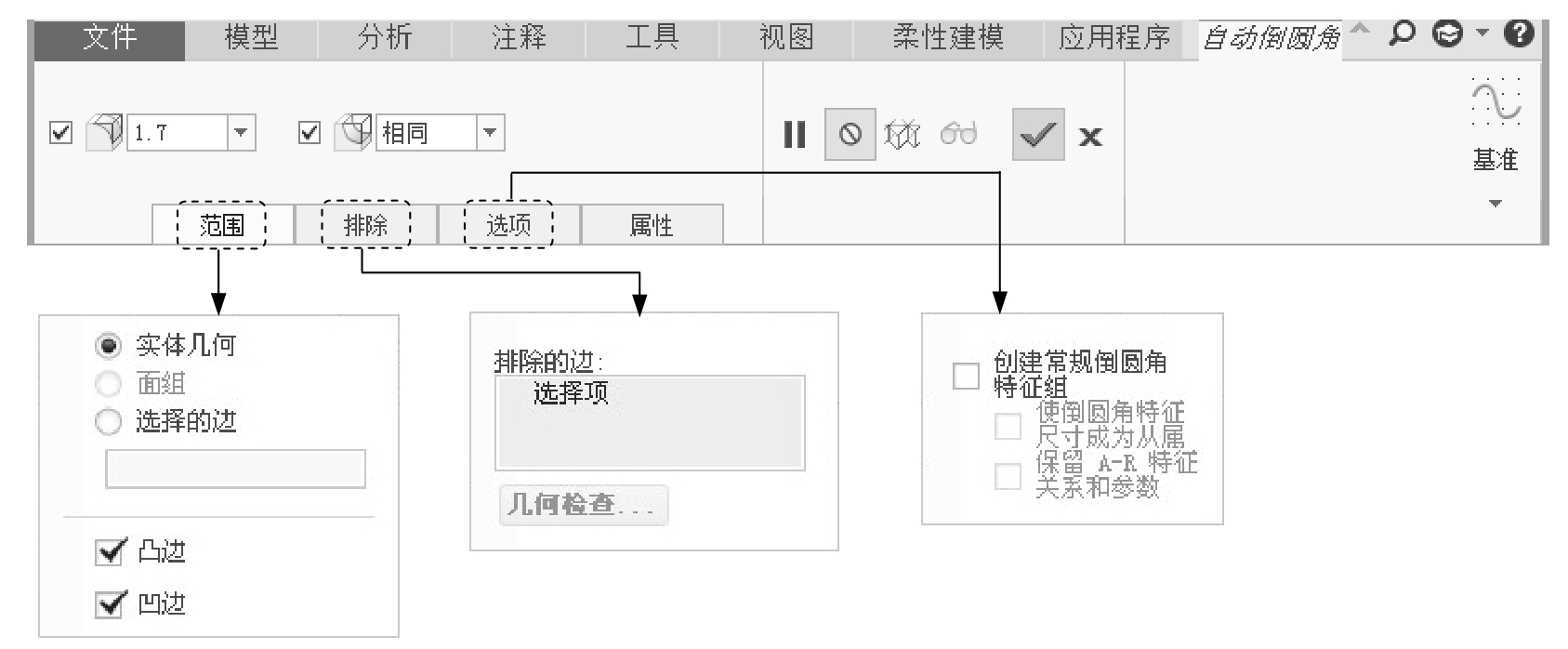 复选框:可以创建一组常规倒圆角特征,而不是创建“自动倒圆角”特征。