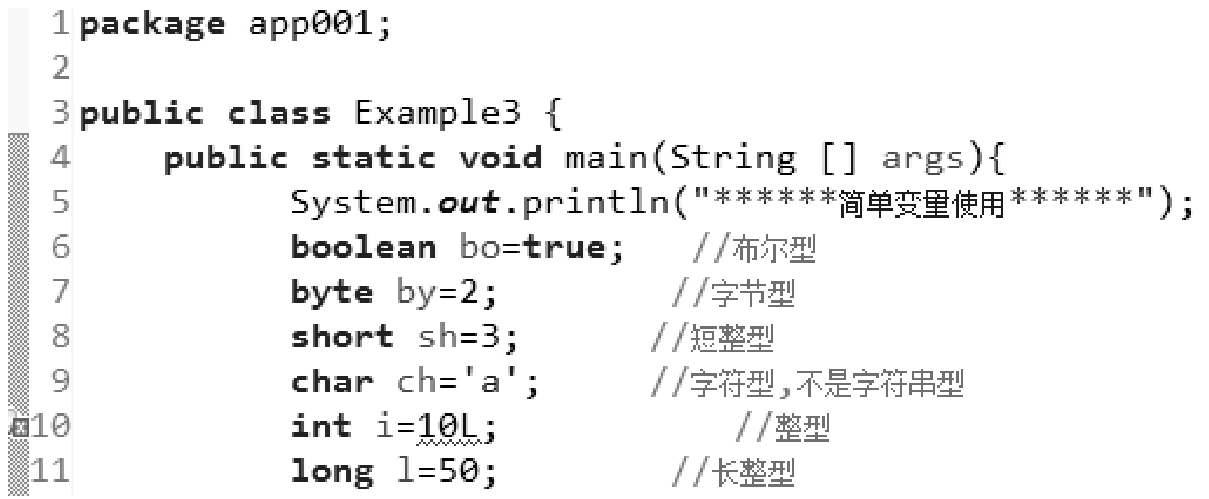 任务3中第11行,将50这个整数赋给长整型变量l,从道理上讲,给长整型赋值,50后面要加后缀L(或者小l),变成50L,这样才对,可是任务3并没有语法错,而将第10行若换成10L,结果如何呢?语法关都过不了。为节省篇幅,列出部分代码,如图1-23所示。