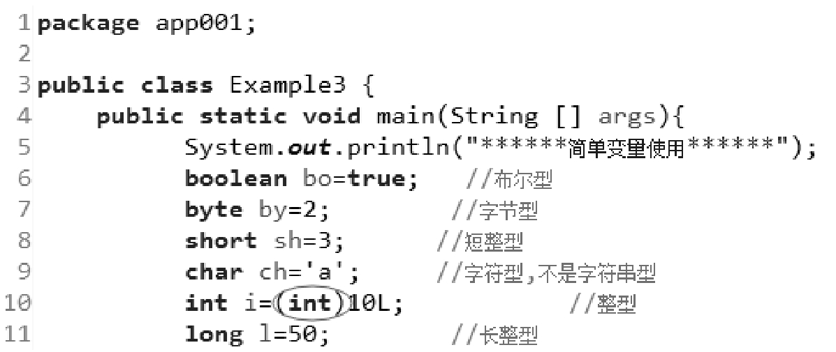 强制类型转换的语法格式就是在你想要转换的数据前加上一对圆括号,圆括号里放的是你想转换成的数据类型。此处第10行就是int i=(int)10L;。