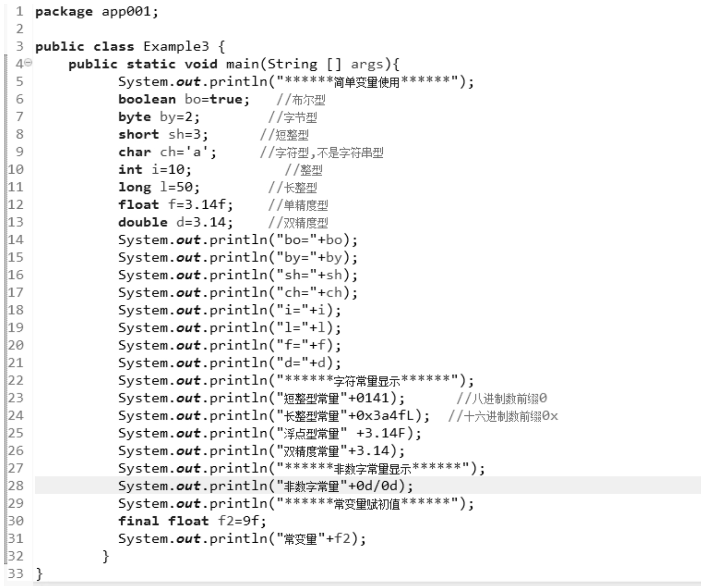 变量就是指在程序运行中其值可以改变的量,其要用标识符表示,具有数据类型,并且遵循先声明后使用的原则。任务3中代码的第6行至第13行都有变量声明,不过这个任务当中,在声明变量的同时赋了初值,这也是可以的。