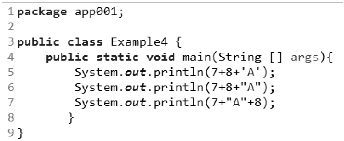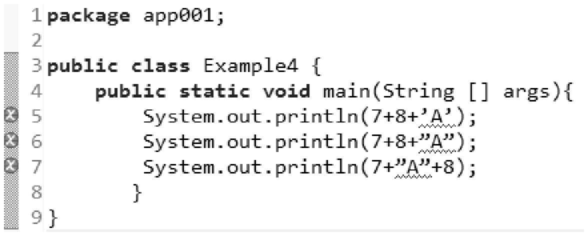 第5行代码输出80,这是为何呢?原来,7+8+65=80;'A'是字符,与整数相加,以整数(ASCII值)参与运算。
