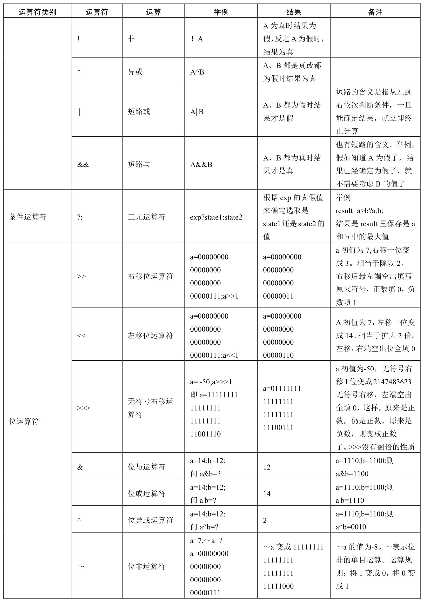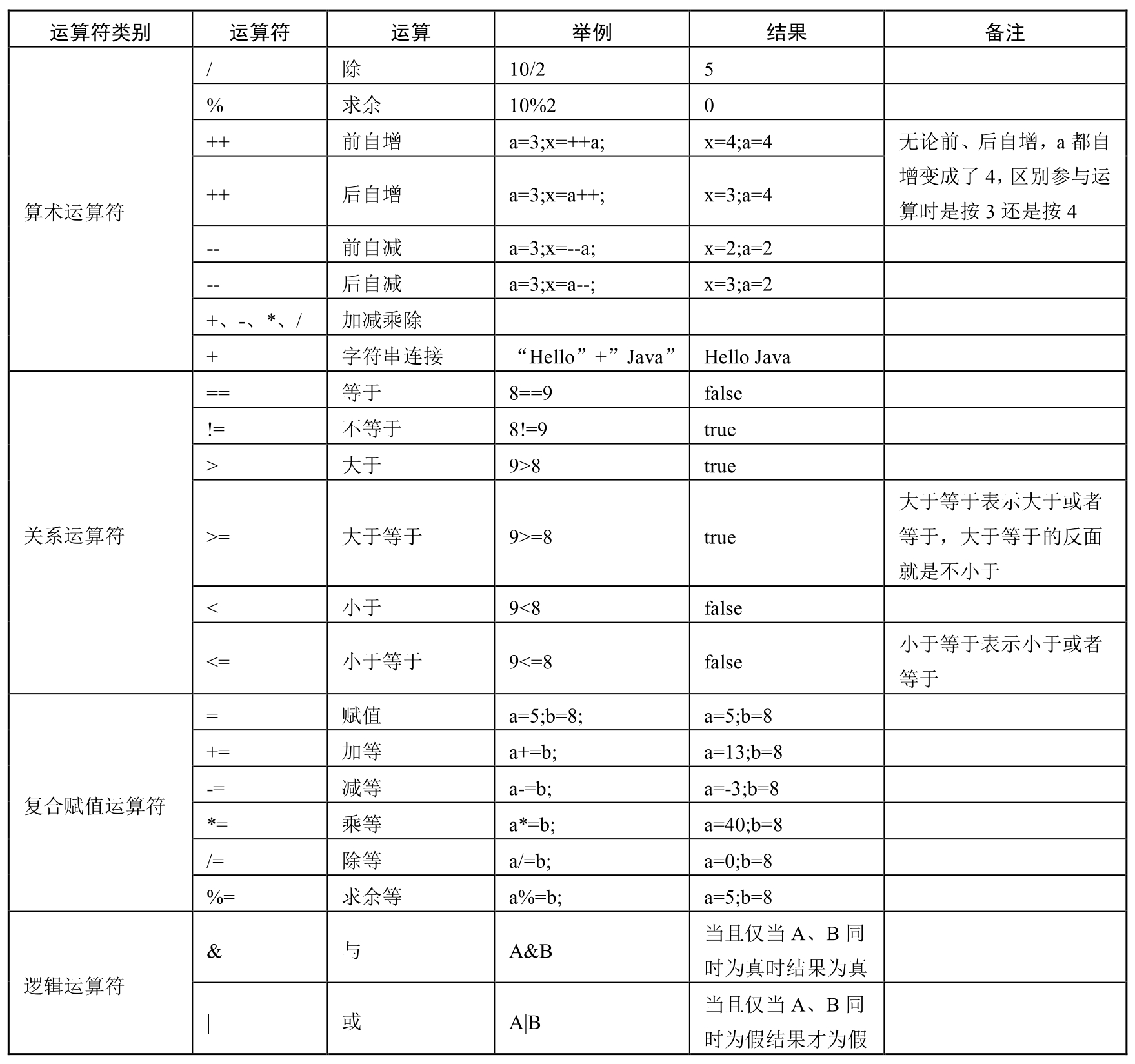 注4: Java运算符列表如表1-2所示。