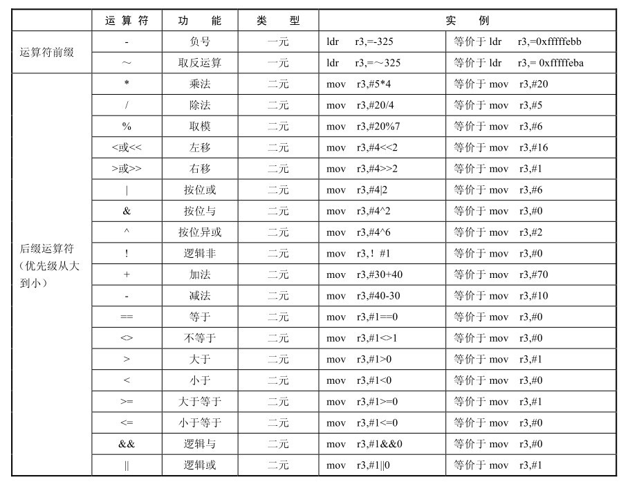 (3)圆点“.”。若圆点“.”单独出现在语句的操作码之后的操作数位置上,则表示当前程序计数器的值被放置在圆点的位置。例如,“b.”语句代表转向本身,相当于永久循环,在调试中希望程序停留在某个地方可以添加这种语句,调试之后应删除。
