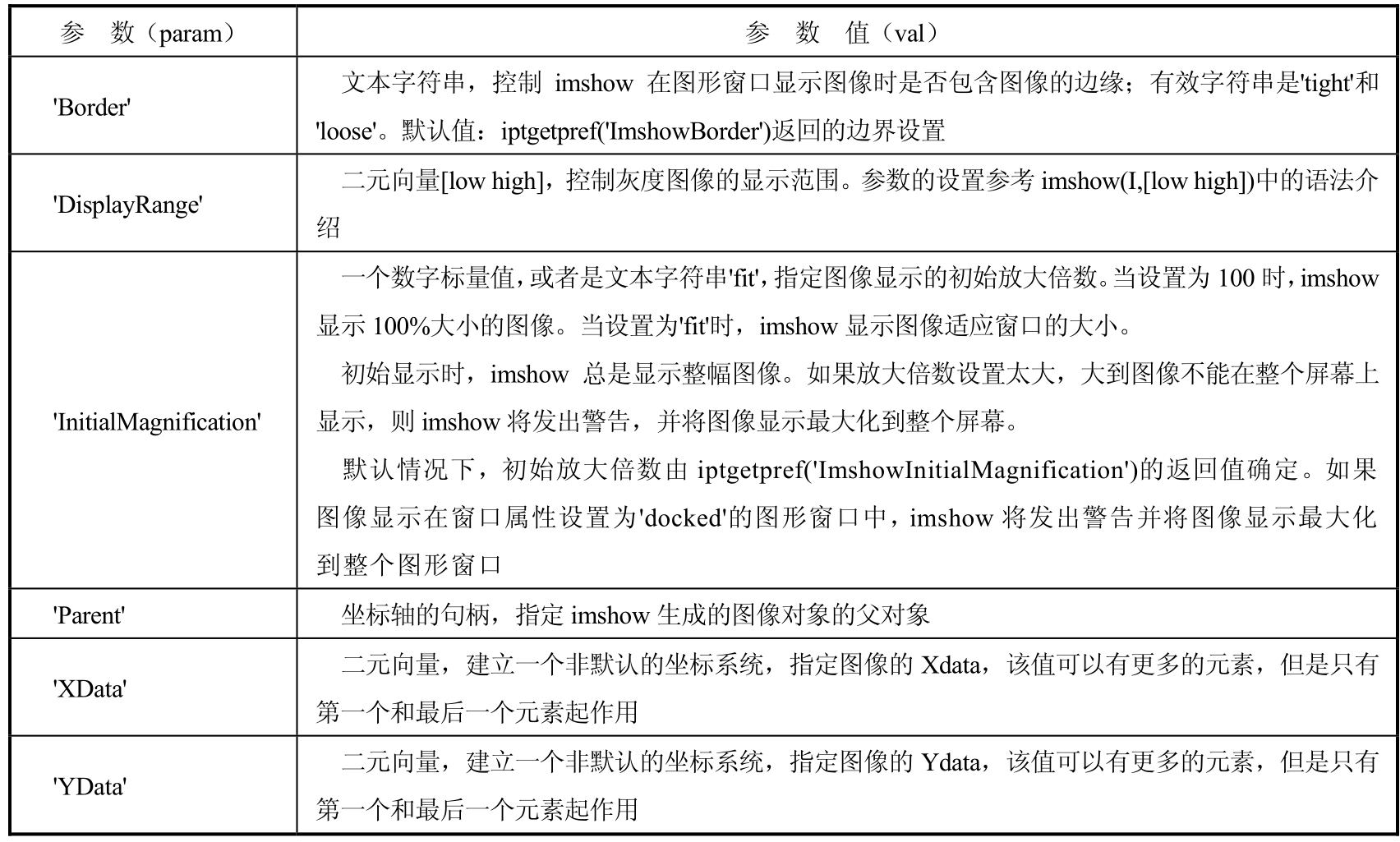 ·imshow(...,param1,val1,param2,val2,...) 指定图像显示参数paramN的值 valN。参量paramN和valN的取值参见表1.1。