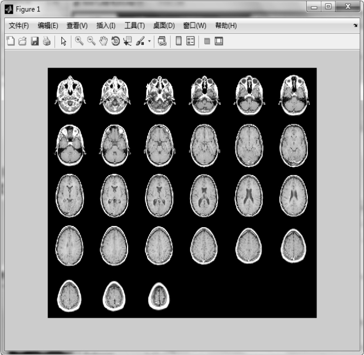 【实例4】 首先显示完整的多帧图像,然后不使用颜色表,最大化D中图像的对比度,显示图像。