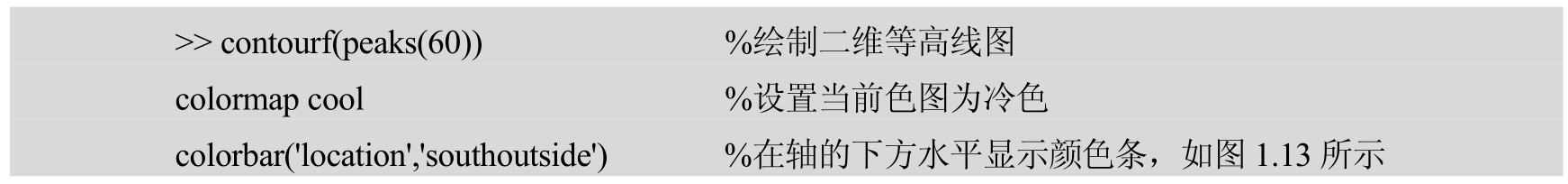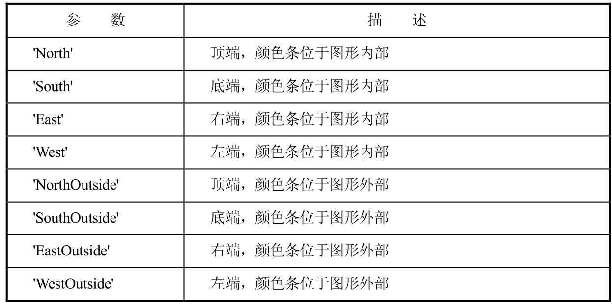 ·colorbar(...,'location') 在坐标轴中的指定位置添加颜色条。字符串参量location用于指定颜色条的位置,具体意义参见表1.2。