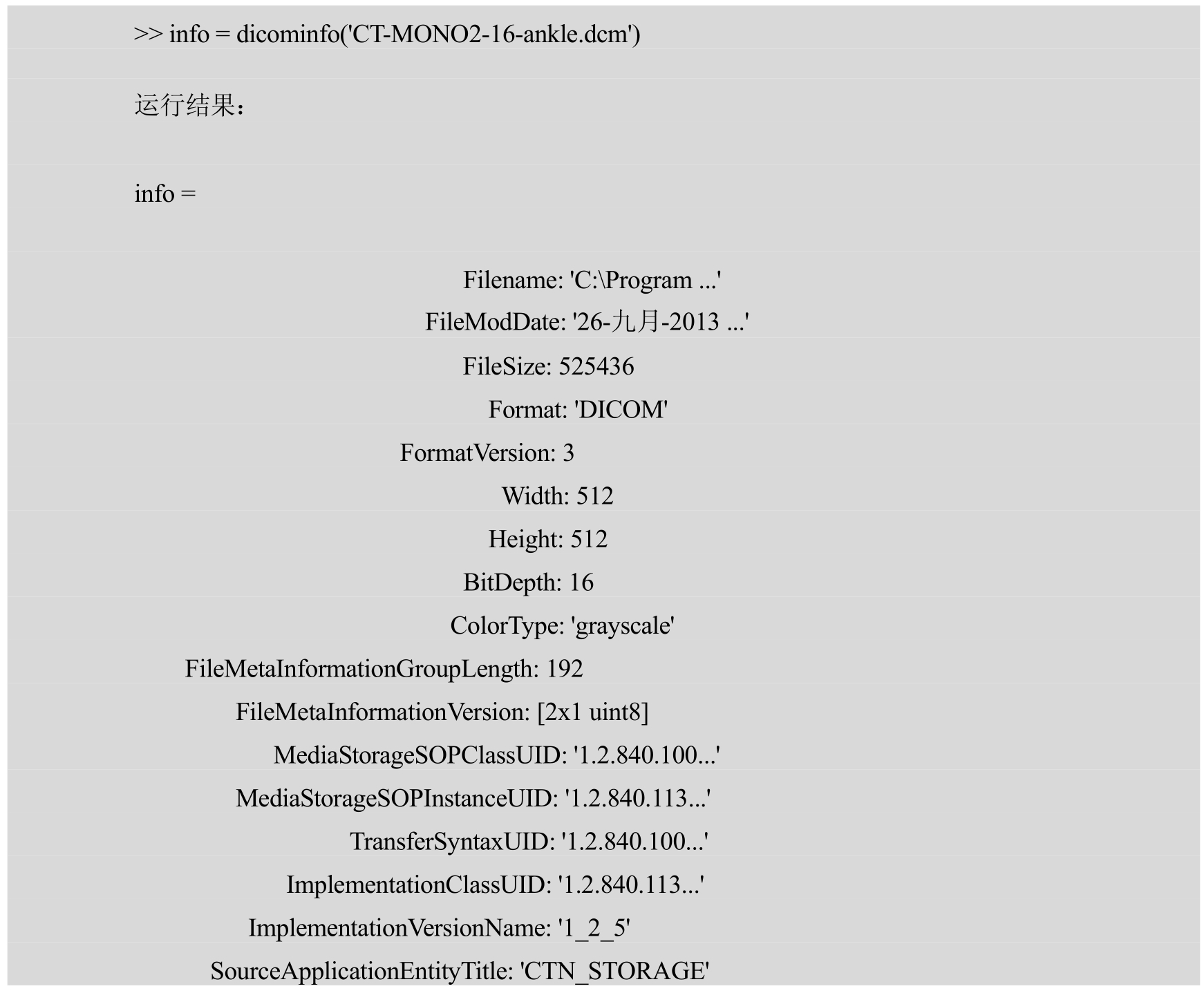 ·info=dicominfo(filename) 从指定的DICOM文件中读取元数据信息。字符串参量filename为DICOM文件名。