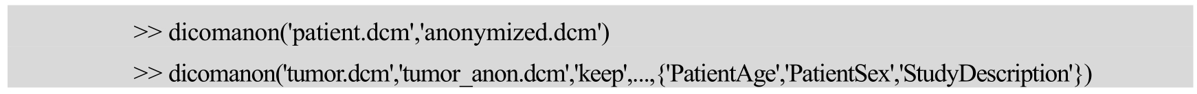 ·dicomanon(file_in,file_out) 从DICOM文件file_in中删除相关数据元素,创建一个新的DICOM文件file_out。file_out中包含修改的信息。