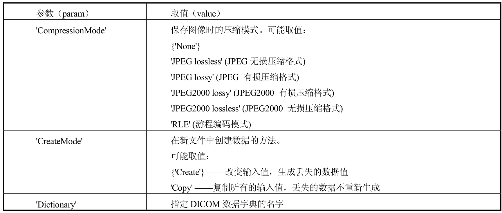 ·dicomwrite(..., param1, value1, param2, value2, ...) 按照指定的格式和属性将图像写入DICOM 文件中。参量 param和 value是表示中间数据中的属性名字字符串或者dicomwrite特有的写入选项,具体如表1.8所示。